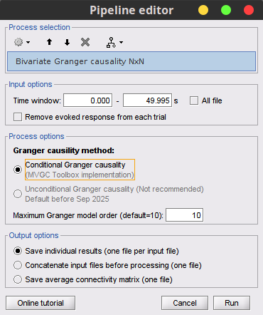 I think I’ve run into a bug in the Bivariate Granger Causality (NxN) routine and I hope you can help me with it. I’m pulling scout time series from a 2-second data segment, but I notice that sometimes one or more scouts return a series of all zeros. As soon as the GC code reaches that channel(s), it stops and fills the entire causality matrix with zeros. I have other examples in my analysis where this happens; the figure attached is just one case.
